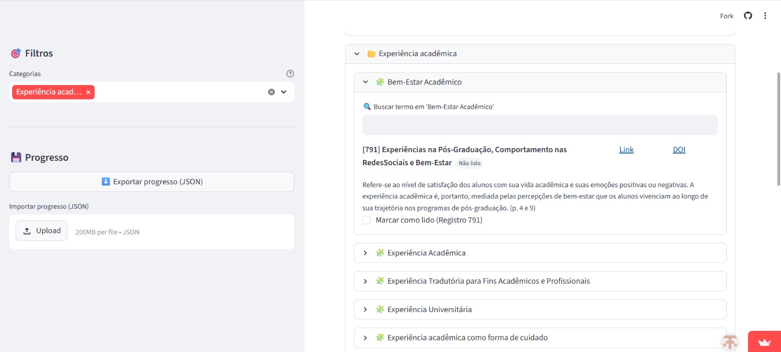 No segundo momento, utilizamos a inteligência artificial para auxiliar na identificação dos trabalhos que apresentam interpretações mais complexas sobre o conceito de “experiência”, possibilitando um maior entendimento das abordagens. Para isso, utilizamos os seguintes comandos na interação com a inteligência artificial: “Busque diferentes definições e conceitos da palavra ‘experiência’, excluindo abordagens de senso comum. O foco deve estar em como o termo é apresentado no contexto deste artigo e no sentido mais profundo da palavra ‘experiência’. Divida esses conceitos em tópicos e indique o número das páginas. Se houver apenas definições que configuram o conceito da palavra ‘experiência’ no senso comum, informe: ‘só há conceitos e definições no sentido comum da palavra’”.
