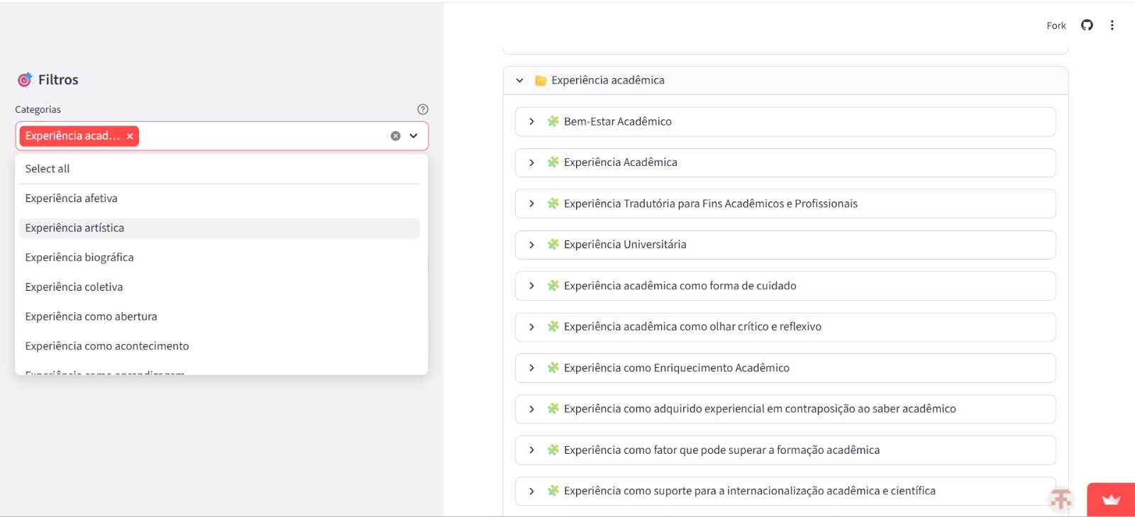 No segundo momento, utilizamos a inteligência artificial para auxiliar na identificação dos trabalhos que apresentam interpretações mais complexas sobre o conceito de “experiência”, possibilitando um maior entendimento das abordagens. Para isso, utilizamos os seguintes comandos na interação com a inteligência artificial: “Busque diferentes definições e conceitos da palavra ‘experiência’, excluindo abordagens de senso comum. O foco deve estar em como o termo é apresentado no contexto deste artigo e no sentido mais profundo da palavra ‘experiência’. Divida esses conceitos em tópicos e indique o número das páginas. Se houver apenas definições que configuram o conceito da palavra ‘experiência’ no senso comum, informe: ‘só há conceitos e definições no sentido comum da palavra’”.